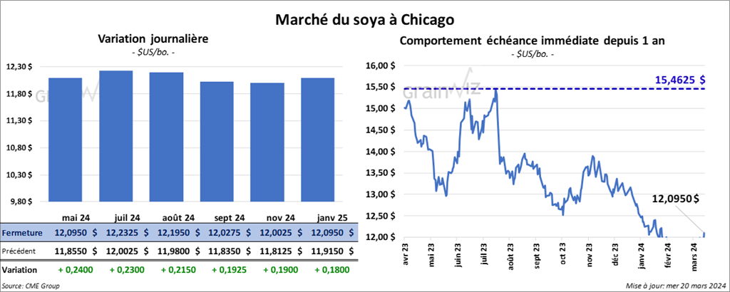 Le contrat de soya US mai 24 a clôturé à 12,0950 $ (+ 24 cents). Celui juil. 24 a fermé à 12,2325 $ (+ 23 cents). Celui août 24 a terminé à 12,1950 $ (+ 21 ½ cents). Quant au tourteau de soya US, le contrat mai 24 a fini à 342,50 $/tonne (+ 8,60 $/tonne). Celui juil. 24 a clôturé à 346,10 $/tonne (+ 8,10 $/tonne). Celui août 24 a fermé à 346,80 $/tonne (+ 7,60 $/tonne). Du côté de l’huile de soya US, le contrat mai 24 a terminé à 49,00 $ (+ 86 points). Celui juil. 24 a fini à 49,52 $ (+ 84 points).