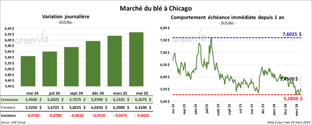 À Chicago, le contrat de blé mai 24 a clôturé à 5,4500 $ (- 7 ½ cents). Celui juil. 24 a fermé à 5,6025 $ (- 7 cents). Celui sept. 24 a terminé à 5,7575 $ (- 6 ½ cents). À Kansas, le contrat de blé dur rouge mai 24 a fini à 5,8040 $ (- 2 ¼ cents). Celui juil. 24 a clôturé à 5,7360 $ (- 1 ¾ cent). Celui sept. 24 a fermé à 5,8400 $ (- 1 ¼ cent). À Minneapolis, le contrat de blé de printemps mai 24 a terminé à 6,5500 $ (- ¾ cent). Celui juil. 24 a fini à 6,6100 $ (- 1 ½ cent). Celui sept. 24 a clôturé à 6,6750 $ (- 2 cents).