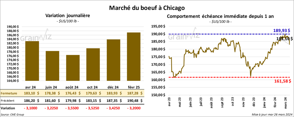 Le contrat de bœuf US avr. 24 a clôturé à 183,10 $ (- 3,10 $). Celui juin 24 a fermé à 178,38 $ (- 3,23 $). Celui août 24 a terminé à 176,43 $ (- 3,55 $). Quant au veau US, le contrat mars 24 a fini à 247,72 $ (- 1,73 $). Celui avr. 24 a clôturé à 245,45 $ (- 6,00 $). Celui mai 24 a fermé à 247,25 $ (- 5,38 $).