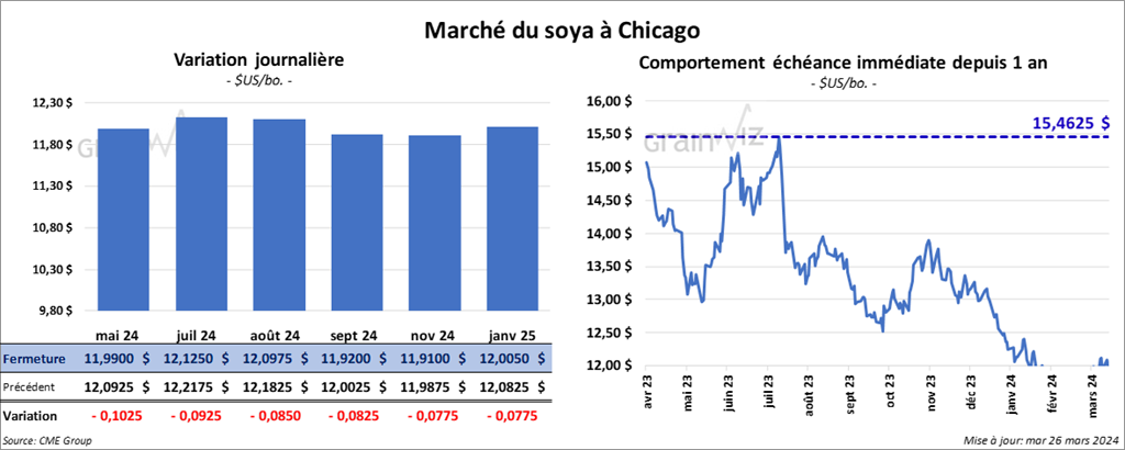 Le contrat de soya US mai 24 a clôturé à 11,9900 $ (- 10 ¼ cents). Celui juil. 24 a fermé à 12,1250 $ (- 9 ¼ cents). Celui août 24 a terminé à 12,0975 $ (- 8 ½ cents). Quant au tourteau de soya US, le contrat mai 24 a fini à 339,80 $/tonne (- 1,90 $/tonne). Celui juil. 24 a clôturé à 343,50 $/tonne (- 1,80 $/tonne). Celui août 24 a fermé à 344,40 $/tonne (- 1,60 $/tonne). Du côté de l’huile de soya US, le contrat mai 24 a terminé à 48,42 $ (- 60 points). Celui juil. 24 a fini à 48,99 $ (- 58 points).