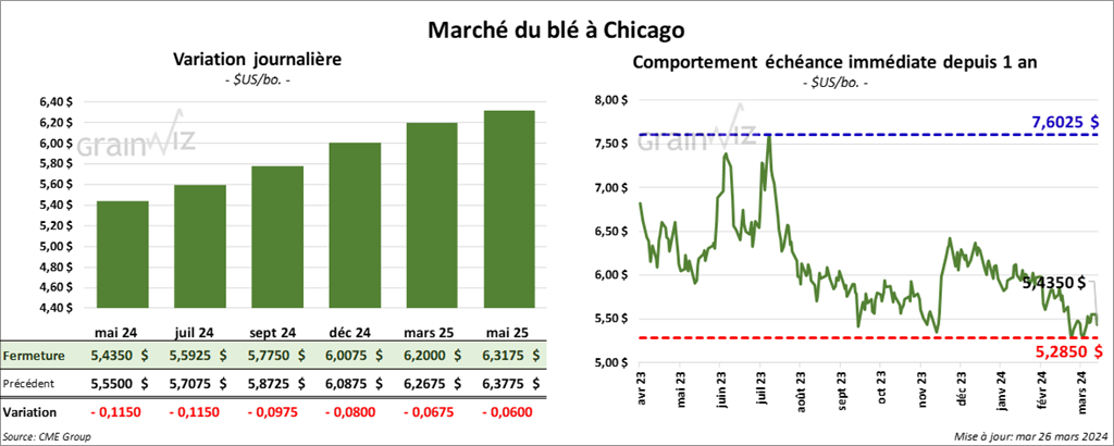 À Chicago, le contrat de blé mai 24 a clôturé à 5,4350 $ (- 11 ½ cents). Celui juil. 24 a fermé à 5,5925 $ (- 11 ½ cents). Celui sept. 24 a terminé 5,7750 $ (- 9 ¾ cents). À Kansas, le contrat de blé dur rouge mai 24 a fini à 5,7720 $ (- 12 ¼ cents). Celui juil. 24 a clôturé à 5,7400 $ (- 11 ½ cents). Celui sept. 24 a fermé à 5,8620 $ (- 10 ½ cents). À Minneapolis, le contrat de blé de printemps mai 24 a terminé à 6,4725 $ (- 12 ¼ cents). Celui juil. 24 a fini à 6,5350 $ (- 10 ¾ cents). Celui sept. 23 a clôturé à 6,6150 $ (- 10 cents).