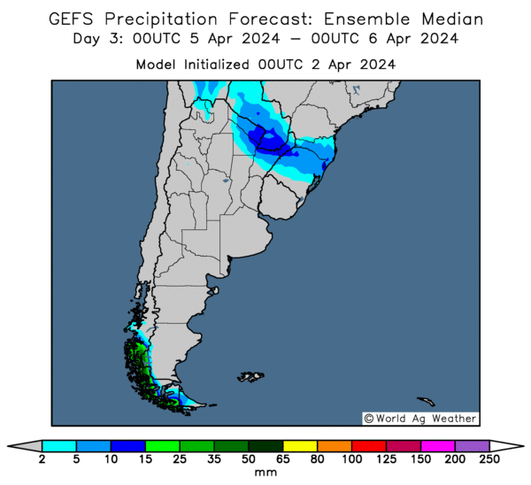 - Cette carte de l’Argentine, fournie par World Ag Weather et dessinée pour les 3 prochains jours, montre notamment des possibilités d’averses dans le Nord (voir les zones en bleu).