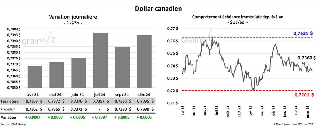 Le contrat de soya US mai 24 a clôturé à 11,7400 $ (- 11 ¾ cents). Celui juil. 24 a fermé à 11,8775 $ (- 11 ¾ cents). Celui août 24 a terminé à 11,8750 $ (- 11 cents). Quant au tourteau de soya US, le contrat mai 24 a fini à 328,30 $/tonne (- 5,10 $/tonne). Celui juil. 24 a clôturé à 332,10 $/tonne (- 5,20 $/tonne). Celui août 24 a fermé à 333,30 $/tonne (- 5,00 $/tonne). Du côté de l’huile de soya US, le contrat mai 24 a terminé à 48,60 $ (+ 36 points). Celui juil. 24 a fini à 49,15 $ (+ 39 points).