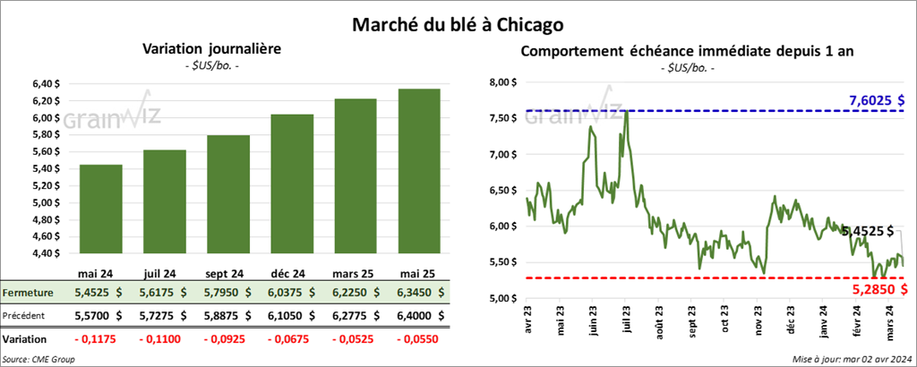À Chicago, le contrat de blé mai 24 a clôturé à 5,4525 $ (- 11 ¾ cents). Celui juil. 24 a fermé à 5,6175 $ (- 11 cents). Celui sept. 24 a terminé à 5,7950 $ (- 9 ¼ cents). À Kansas, le contrat de blé dur rouge mai 24 a fini à 5,6320 $ (- 12 ¼ cents). Celui juil. 24 a clôturé à 5,5740 $ (- 13 ½ cents). Celui sept. 24 a fermé à 5,7100 $ (- 12 ½ cents). À Minneapolis, le contrat de blé de printemps mai 24 a terminé à 6,2750 $ (- 7 ¼ cents). Celui juil. 24 a fini à 6,3700 $ (- 7 ½ cents). Celui sept. 24 a clôturé à 6,4750 $ (- 6 ¼ cents).