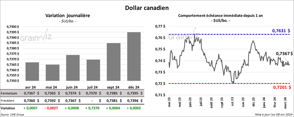 Le contrat de maïs mai 24 a clôturé à 4,3550 $ (+ 1 ¼ cent). Celui juil. 24 a fermé à 4,4750 $ (+ ¾ cent). Celui sept. 24 a terminé à 4,5725 $ (+ ¼ cent).
