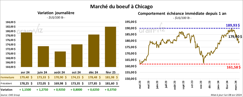 Le contrat de bœuf US avr. 24 a clôturé à 179,40 $ (+ 1,15 $). Celui juin 24 a fermé à 173,33 $ (+ 1,28 $). Celui août 24 a terminé à 170,90 $ (+ 93 cents). Quant au veau US, le contrat avr. 24 a fini à 239,30 $ (+ 1,60 $). Celui mai 24 a clôturé à 237,18 $ (-1,00 $). Celui août 24 a fermé à 248,25 $ (- 38 cents).
