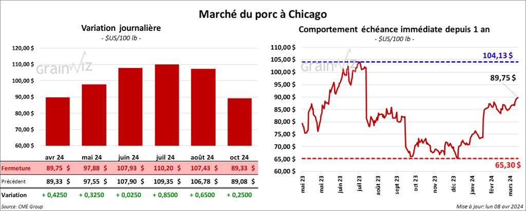 Le contrat de porc US avr. 24 a clôturé à 89,75 $ (+ 43 cents). Celui mai 24 a fermé à 97,88 $ (+ 33 cents). Celui juin 24 a terminé à 107,93 $. (+ 3 cents).