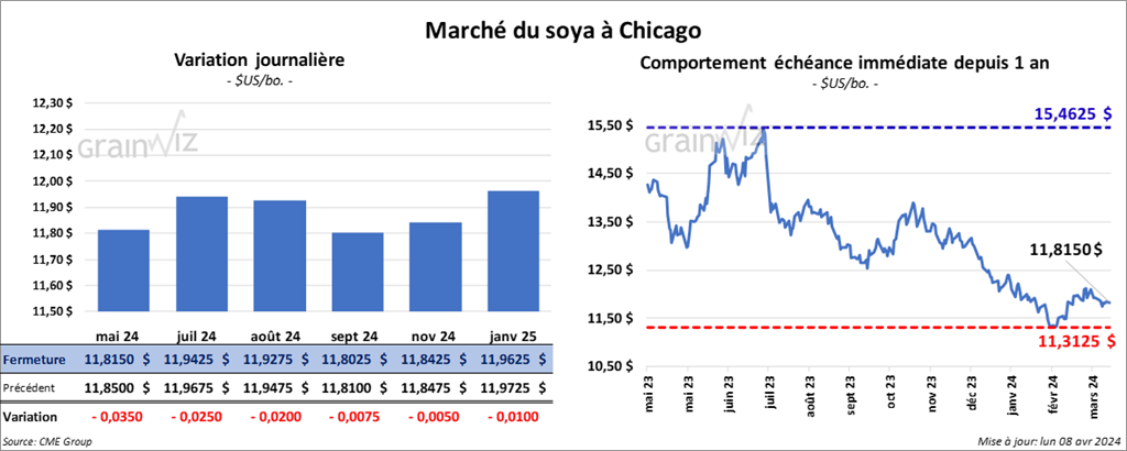 Le contrat de soya US mai 24 a clôturé à 11,8150 $ (- 3 ½ cents). Celui juil. 24 a fermé à 11,9425 $ (- 2 ½ cents). Celui août 24 a terminé à 11,9275 $ (- 2 cents). Quant au tourteau de soya US, le contrat mai 24 a fini à 336,00 $/tonne (+ 2,90 $/tonne). Celui juil. 24 a clôturé à 339,10 $/tonne (+ 2,90 $/tonne). Celui août 24 a fermé à 339,70 $/tonne (+ 3,10 $/tonne). Dans le cas de l’huile de soya US, le contrat mai 24 a terminé à 47,90 $ (- 99 points). Celui juil. 24 a fini à 48,45 $ (- 94 points).