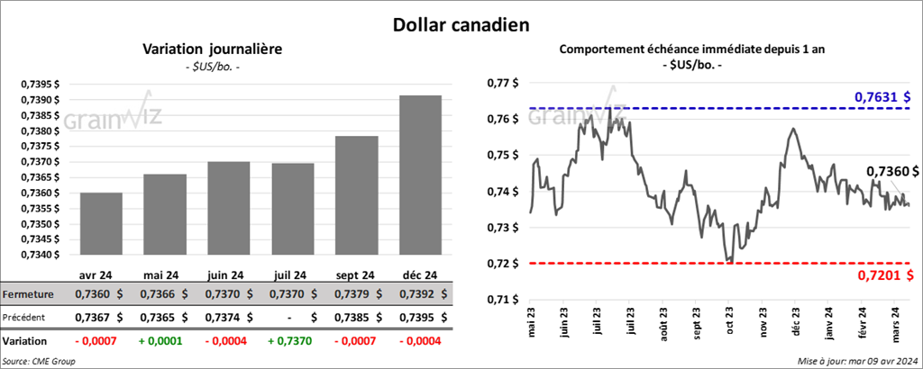 Le contrat de maïs US mai 24 a clôturé à 4,3125 $ (- 4 ¼ cents). Celui juil. 24 a fermé à 4,4250 $ (- 5 cents). Celui sept. 24 a terminé à 4,5225 $ (- 5 cents).