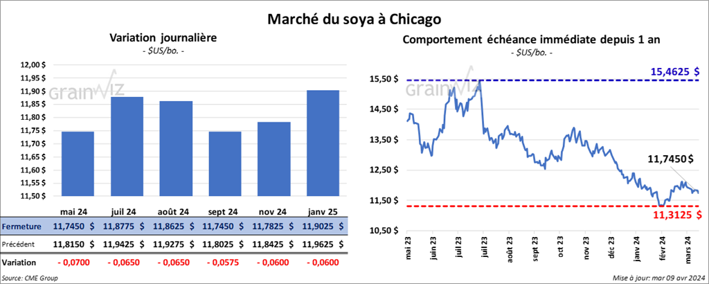 Le contrat de soya US, mai 24 a clôturé à 11,7450 $ (- 7 cents). Celui juil. 24 a fermé à 11,8775 $ (- 6 ½ cents). Celui août 24 a terminé à 11,8625 (- 6 ½ cents). Quant au tourteau de soya US. Le contrat mai 24 a fini à 335,60 $/tonne (- 40 cents/tonne). Celui juil. 24 a clôturé à 338,60 $/tonne (- 50 cents/tonne). Celui août 24 a fermé à 339,00 $/tonne (- 70 cents/tonne). Du côté de l’huile de soya US, le contrat mai 24 a terminé à 47,52 $ (- 38 points). Celui juil. 24 a fini à 48,04 $ (- 41 points).