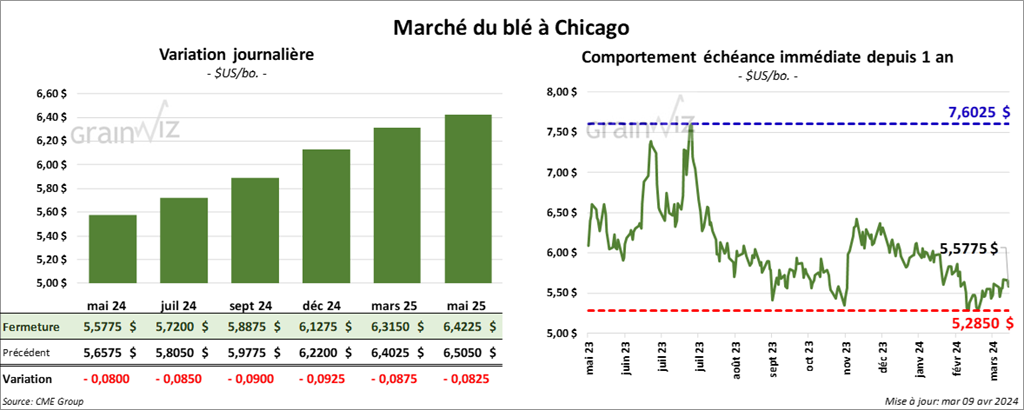 À Chicago, le contrat de blé mai 24 a clôturé à 5,5775 $ (- 8 cents). Celui juil. 24 a fermé à 5,7200 $ (- 8 ½ cents). Celui sept. 24 a terminé à 5,8875 $ (- 9 cents). À Kansas, le contrat de blé dur rouge mai 24 a fini à 5,7720 $ (- 8 cents). Celui juil. 24 a clôturé à 5,7420 $ (- 10 ¼ cents). Celui sept. 24 a fermé à 5,8620 $ (- 10 ½ cents). À Minneapolis, le contrat de blé de printemps mai 24 a terminé à 6,5125 $ (+ 1 cent). Celui juil. 24 a fini à 6,5775 $ (- 1 ¼ cent). Celui sept. 24 a clôturé à 6,6600 $ (- 2 ½ cents).