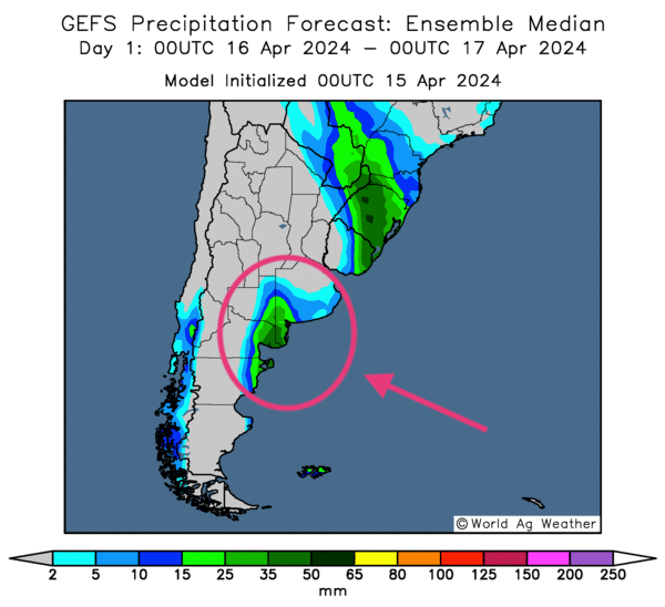- Cette carte de l’Argentine, fournie par World Ag Weather et dessinée pour demain, montre notamment des possibilités d’averses pour le centre est, aux à alentours de la province de Buenos Aires et plus au sud (voir les zones encerclées).
