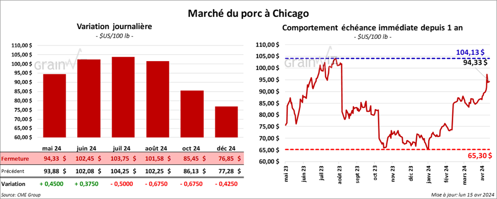 Le contrat de porc US mai 24 a clôturé à 94,33 $ (+ 45 cents). Celui juin 24 a fermé à 102,45 $ (+ 38 cents). Celui juil. 24 a terminé à 103,75 $ (- 50 cents).