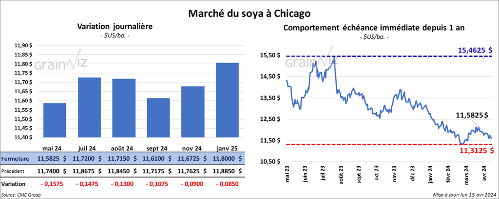 Le contrat de soya US mai 24 a clôturé à11,5825 $ (- 15 ¾ cents). Celui juil. 24 a fermé à 11,7200 $ (- 14 ¾ cents). Celui août 24 a terminé à 11,7150 $ (- 13 cents). Quant au tourteau de soya US, le contrat mai 24 a fini à 338,50 $/tonne (- 5,90 $/tonne). Celui juil. 24 a clôturé à 339,60 $/tonne (- 4,50 $/tonne). Celui août 24 a fermé à 340,20 $/tonne (- 3,90 $/tonne). Du côté de l’huile de soya US, le contrat mai 24 a terminé à 45,47 $ (- 42 points). Celui juil. 24 a fini à 46,01 $ (- 44 points).