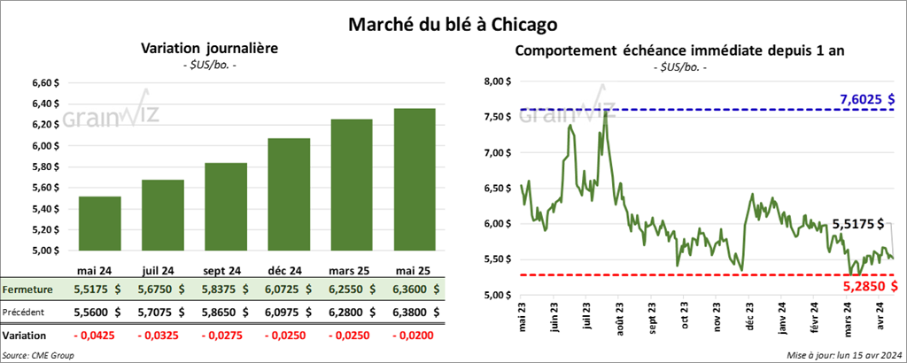 À Chicago, le contrat de blé mai 24 a clôturé à 5,5175 $ (- 4 ¼ cents). Celui juil. 24 a fermé à 5,6750 $ (- 3 ¼ cents). Celui sept. 24 a terminé à 5,8375 $ (- 2 ¾ cents). À Kansas, le contrat de blé dur rouge mai 24 a fini à 5,8400 $ (- 5 ¾ cents). Celui juil. 24 a clôturé à 5,8060 $ (- 6 ¼ cents). Celui sept. 24 a fermé à 5,9140 $ (- 6 cents). À Minneapolis, le contrat de blé de printemps mai 24 a terminé à 6,3700 $ (- 5 ¾ cents). Celui juil. 24 a fini à 6,5375 $ (- 5 ¼ cents). Celui sept. 24 a clôturé à 6,5375 $ (- 5 ¼ cents).