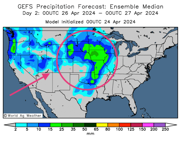 - Cette carte US, fournie par World Ag Weather et dessinée pour les 2 prochains jours, indique notamment des probabilités de pluies abondantes pour l’ouest du Corn Belt et l’est des Plaines US (voir les zones vertes).