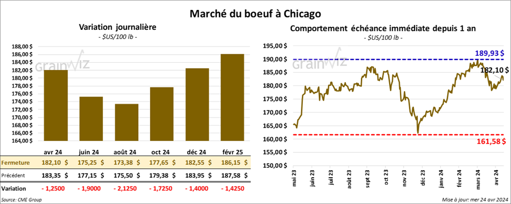 Le contrat de bœuf US avr. 24 a clôturé à 182,10 $ (- 1,25 $). Celui juin 24 a fermé à 175,25 $ (- 1,90 $). Celui août 24 a terminé à 173,38 $ (- 2,13 $). Quant au veau US, le contrat avr. 24 a fini à 243,10 $ (- 65 cents). Celui mai 24 a clôturé à 244,10 $ (- 1,95 $). Celui août 24 a fermé à 256,30 $ (- 3,10 $).