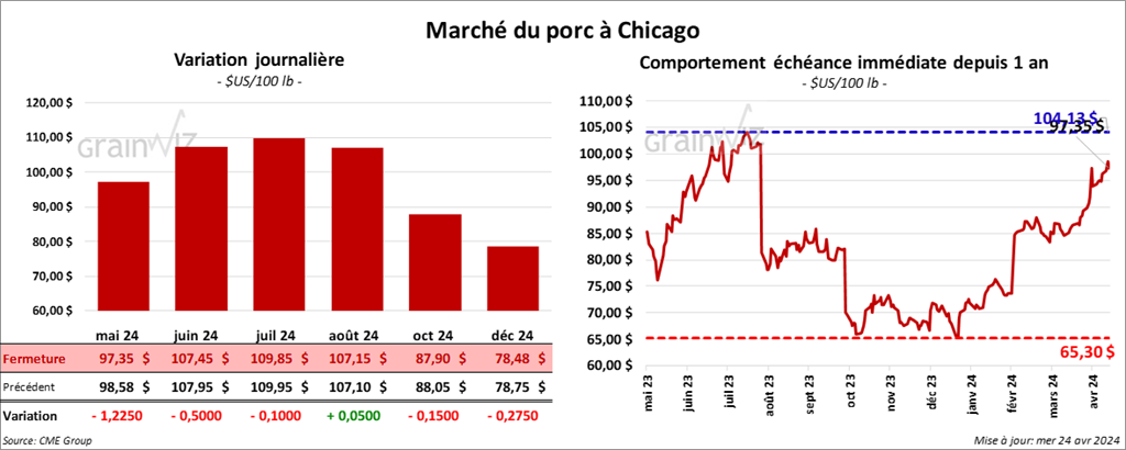 Le contrat de porc US mai 24 a clôturé à 97,35 $ (- 1,23 $). Celui juin 24 a fermé à 107,45 $ (- 50 cents). Celui juil. 24 a terminé à 109,85 $ (- 10 cents).