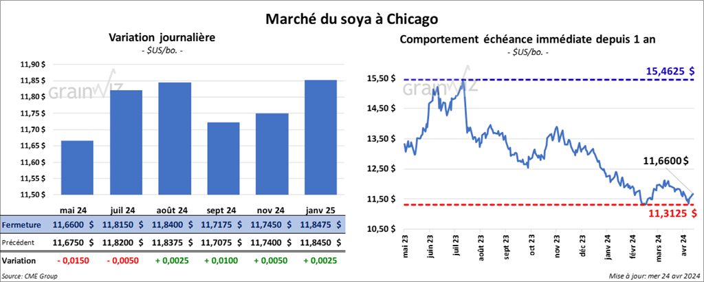 Le contrat de soya US mai 24 a clôturé à 11,6600 $ (- 1 ½ cent). Celui juil. 24 a fermé à 11,8150 $ (- ½ cent). Celui août 24 a terminé à 11,8400 $ (+ ¼ cent). Quant au tourteau de soya US, le contrat mai 24 a fini à 346,00 $/tonne (+ 80 cents/tonne). Celui juil. 24 a clôturé à 349,20 $/tonne (+ 3,10 $/tonne). Celui août 24 a fermé à 350,00 $/tonne (+ 3,70 $/tonne). Du côté de l’huile de soya US, le contrat mai 24 a terminé à 44,66 $ (- 65 points). Celui juil. 24 a fini à 45,27 $ (- 61 points).