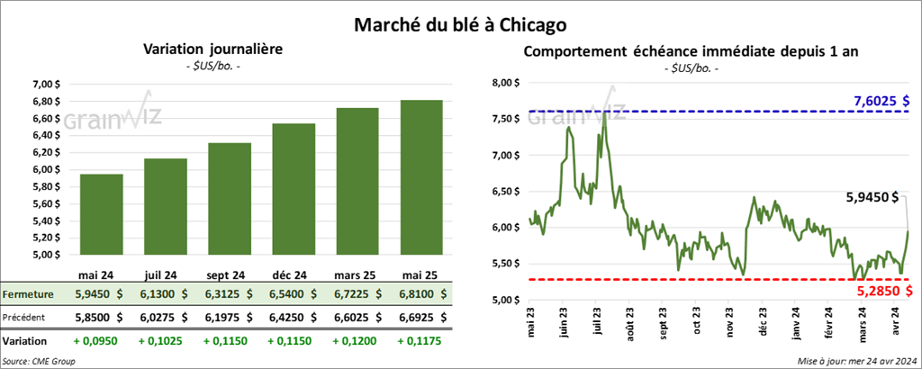 À Chicago, le contrat de blé mai 24 a clôturé à 5,9450 $ (+ 9 ½ cents). Celui juil. 24 a fermé à 6,1300 $ (+ 10 ¼ cents). Celui sept. 24 a terminé à 6,3125 $ (+ 11 ½ cents). À Kansas, le contrat de blé dur rouge mai 24 a fini à 6,2420 $ (+ 15 ½ cents). Celui juil. 24 a clôturé à 6,3000 $ (+ 15 ¾ cents). Celui sept. 24 a fermé à 6,4220 $ (+ 16 ¼ cents). À Minneapolis, le contrat de blé de printemps mai 24 a terminé à 6,7900 $ (+ 12 ½ cents). Celui juil. 24 a fini à 6,8550 $ (+ 13 ¼ cents). Celui sept. 24 a clôturé à 6,9325 $ (+ 12 cents).