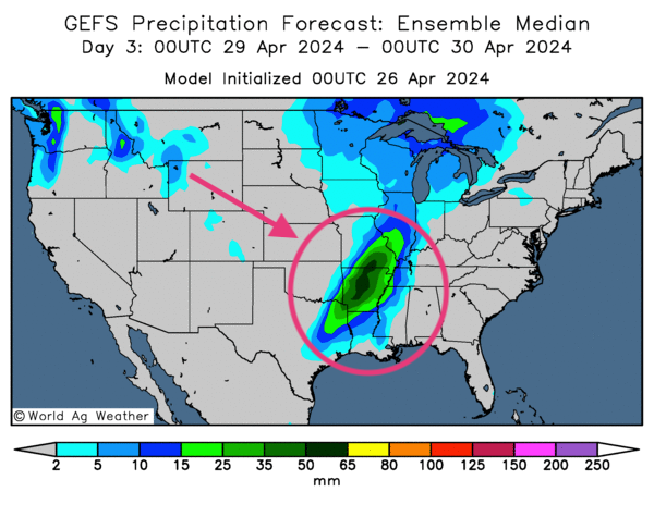 - Cette carte US, fournie par World Ag Weather et dessinée pour les 3 prochains jours, indique notamment des probabilités de pluies abondantes pour le Centre du Midwest et le Sud-Est US (voir les zones vertes). Certaines parties du Texas, de la Louisiane, de l’Alabama, du Missouri et de l’Illinois sont particulièrement visées.