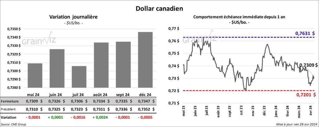 Le contrat de maïs US mai 24 a clôturé à 4,4000 $ (- 1 cent). Celui juil. 24 a fermé à 4,5000 $ (- 2 cents). Celui sept. 24 a terminé à 4,5900 $ (- 2 ¾ cents).