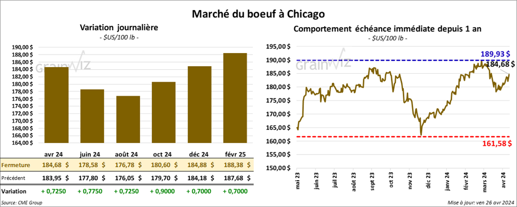 Le contrat de bœuf US avr. 24 a clôturé à 184,68 $ (+ 73 cents). Celui juin 24 a fermé à 178,58 $ (+ 78 cents). Celui août 24 a terminé à 176,78 $ (+ 73 cents). Quant au veau US, le contrat mai 24 a fini à 248,70 $ (+ 2,45 $). Celui août 24 a clôturé à 260,55 $ (+ 2,25 $). Celui sept. 24 a fermé 261,57 $ (+ 2,15 $).