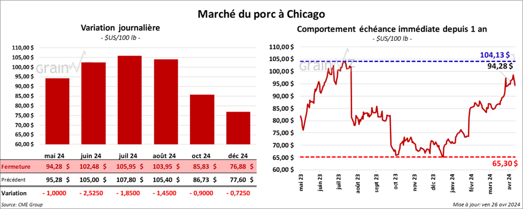 Le contrat de porc US mai 24 a clôturé à 94,28 $ (- 1,00 $). Celui juin 24 a fermé à 102,48 $ (- 2,53 $). Celui juil. 24 105,95 $ (- 1,85 $).
