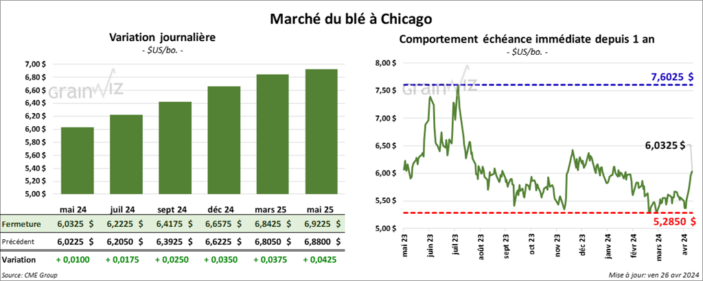 À Chicago, le contrat de blé mai 24 a clôturé à 6,0325 $ (+ 1 cent). Celui juil. 24 a fermé à 6,2225 $ (+ 1 ¾ cent). Celui sept. 24 a terminé à 6,4175 $ (+ 2 ½ cents). À Kansas, le contrat de blé dur rouge mai 24 a fini à 6,4620 $ (+ 14 ¼ cent). Celui juil. 24 a clôturé à 6,5420 $ (+ 13 ¾ cents). Celui sept. 24 a fermé à 6,6620 $ (+ 13 ¾ cents). À Minneapolis, le contrat mai 24 a terminé à 6,9725 $ (+ 6 ¼ cents). Celui juil. 24 a fini à 7,0350 $ (+ 5 ¼ cents). Celui sept. 24 a clôturé à 7,1000 $ (+ 5 ¼ cents).