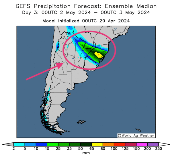 - Cette carte de l’Argentine, fournie par World Ag Weather et dessinée pour les 3 prochains jours, montre notamment des possibilités de pluies abondantes dans le Nord-Est argentin. Elle indique aussi que le système pourrait s’étaler plus au nord, vers l’État brésilien du Rio Grande do Sul.