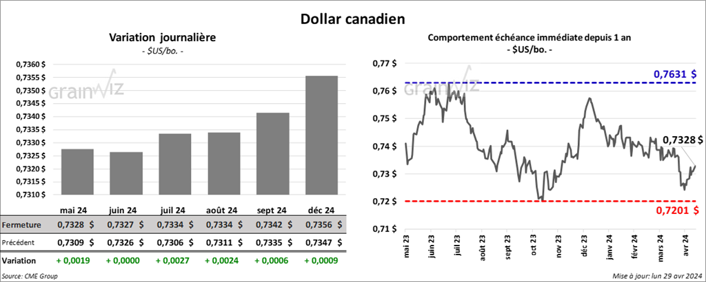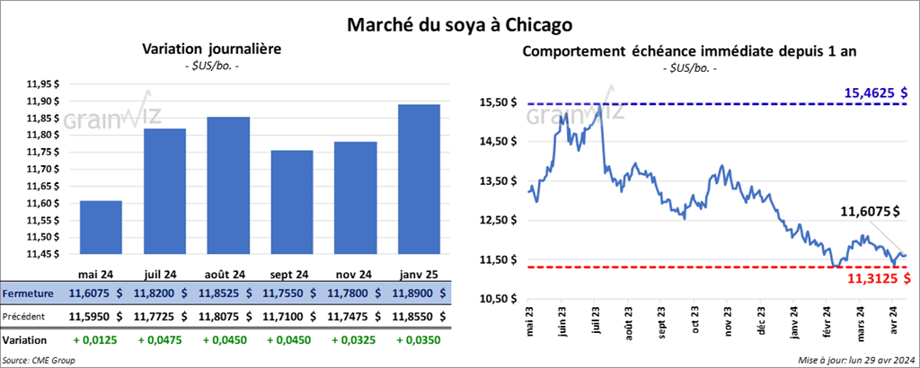Le contrat de soya US mai 24 a clôturé à 11,6075 $ (+ 1 ¼ cent). Celui juil. 24 fermé à 11,8200 $ (+ 4 ¾ cents). Celui août 24 a terminé à 11,8525 $ (+ 4 ½ cents). Quant au tourteau de soya US, le contrat mai 24 a fini à 348,30 $/tonne (+ 8,30 $/tonne). Celui juil. 24 a clôturé à 354,30 $/tonne (+ 9,60 $/tonne). Celui août 24 a fermé à 355,10 $/tonne (+ 9,30 $/tonne). Du côté de l’huile de soya US, le contrat mai 24 a terminé à 43,69 $ (- 124 points). Celui juil. 24 a fini à 44,37 $ (- 117 points).