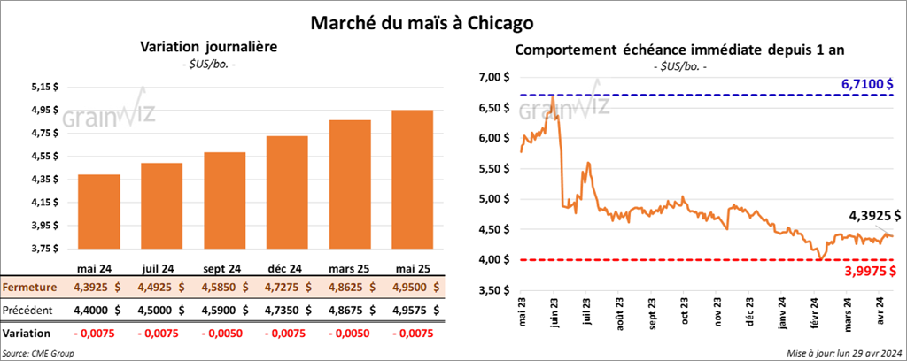 Le contrat de maïs US mai 24 a clôturé à 4,3925 $ (- ¾ cent). Celui juil. 24 a fermé à 4,4925 $ (- ¾ cent). Celui sept. 24 a terminé à 4,5850 $ (- ½ cent).