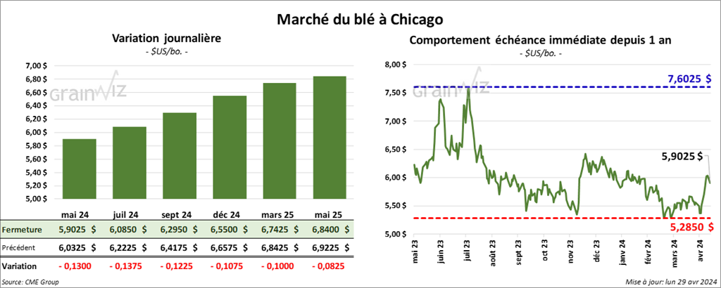 À Chicago, le contrat de blé mai 24 a clôturé à 5,9025 $ (- 13 cents). Celui juil. 24 a fermé à 6,0850 $ (- 13 ¾ cents). Celui sept. 24 a terminé à 6,2950 $ (- 12 ¼ cents). À Kansas, le contrat de blé dur rouge mai 24 a fini à 6,4360 $ (- 2 ½ cents). Celui juil. 24 a clôturé à 6,5040 $ (- 3 ¾ cents). Celui sept. 24 a fermé à 6,6300 $ (- 3 ¼ cents). À Minneapolis, le contrat de blé de printemps mai 24 a terminé à 7,1525 $ (+ 18 cents). Celui juil. 24 a fini à 7,0775 $ (+ 4 ¼ cents). Celui sept. 24 a clôturé à 7,1400 $ (+ 4 cents).