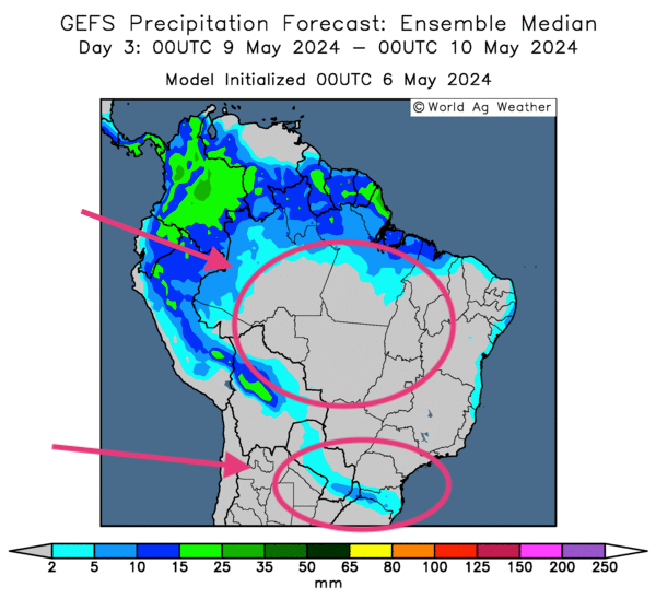- World Weather mentionne que des averses additionnelles pourraient survenir au cours de la semaine dans plusieurs secteurs du sud du Brésil, spécialement dans le Rio Grande do Sul, une région de l’extrême sud du Brésil affectée par des inondations qui ont déjà fait plusieurs morts. Les météorologues de l’organisme pensent aussi que le temps sec qui afflige actuellement le centre sud du Brésil pourrait persister tout au long de la semaine.