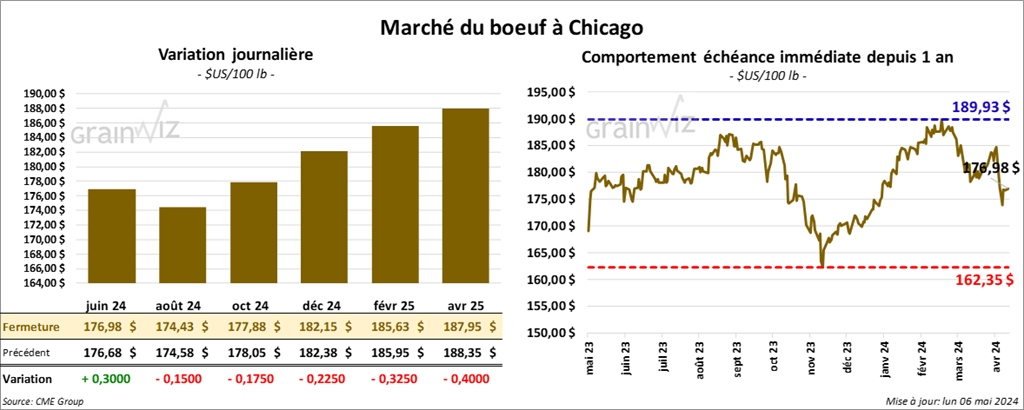 Le contrat de bœuf US juin 24 a clôturé à 176,98 $ (+ 30 cents). Celui août 24 a fermé à 174,43 $ (- 15 ½ cents). Celui oct. 24 a terminé à 177,88 $ (- 17 ½ cents). Quant au veau US, le contrat mai 24 a fini à 241,40 $ (- 1,90 $). Celui août 24 a clôturé à 252,88 $ (- 1,88 $). Celui sept. 24 a fermé à 253,88 $ (- 1,90 $).