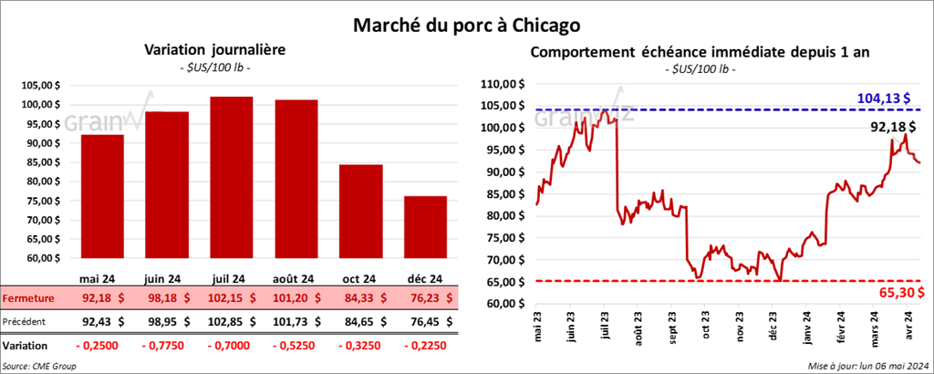 Le contrat de porc US mai 24 a clôturé à 92,18 $ (- 25 cents). Celui juin 24 a fermé à 98,18 $ (- 78 cents). Celui juil. 24 a terminé à 102,15 $ (- 70 cents).