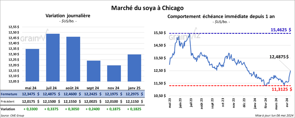 Le contrat de soya US mai 24 a clôturé à 12,3475 $ (+ 33 cents). Celui juil. 24 a fermé À 12.4875 $ (+ 33 ¾ cents). Celui août 24 a terminé à 12,4600 $ (+ 30 ½ cents). Quant au tourteau de soya US, le contrat mai 24 a fini à 381,20 $/tonne (+ 14,70 $/tonne). Celui juil. 24 a clôturé à 387,60 $/tonne (+ 15,40 $/tonne). Celui août 24 a fermé à 385,10 $/tonne (+ 13,50 $/tonne). Du côté de l’huile de soya US, le contrat mai 24 a terminé à 43,17 $ (+ 75 points). Celui juil. 24 a fini à 43,84 $ (+ 76 points).
