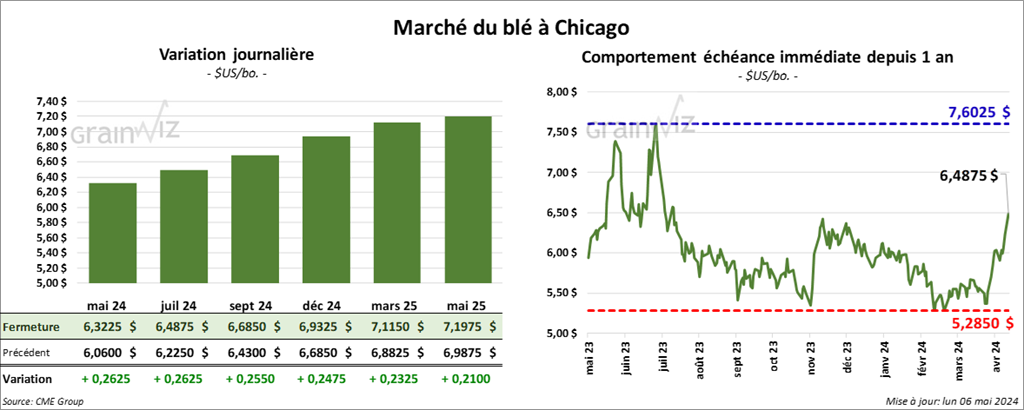 À Chicago, le contrat de blé mai 24 a clôturé à 6,3225 $ (+ 26 ¼ cents). Celui juil. 24 a fermé à 6,4875 $ (+26 ¼ cents). Celui sept. 24 a terminé à 6,6850 $ (+ 25 ½ cents). À Kansas, le contrat de blé dur rouge mai 24 a fini à 6,8500 $ (+ 25 cents). Celui juil. 24 a clôturé à 6,7520 $ (+ 25 cents). Celui sept. 24 a fermé à 6,8620 $ (+ 23 cents). À Minneapolis, le contrat de blé de printemps mai 24 a terminé à 7,0825 $ (0,0). Celui juil. 24 a fini à 7,2550 $ (+ 11 cents). Celui sept. 24 a clôturé à 7,3075 $ (+ 11 ¼ cents).