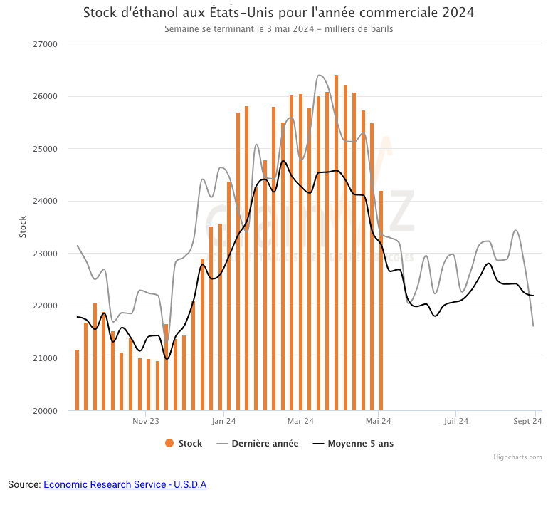 Quant aux inventaires d’éthanol US, ils ont été évalués à 24,200 tonnes, ce qui était un creux depuis le 29 décembre dernier. Il s’agissait en fait d’une baisse de 5,1 % comparativement à la semaine précédente et d’une augmentation de 3,9 % par rapport à l’an dernier.