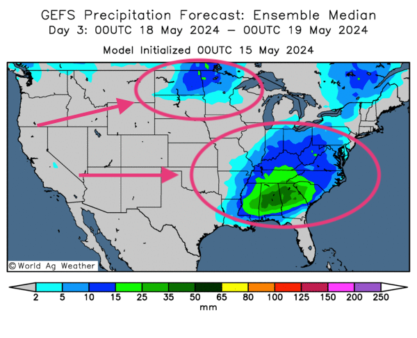 Cette carte US, fournie par World Ag Weather et dessinée pour les 3 prochains jours, indique notamment des possibilités de pluies abondantes pour le sud-est US et certaines parties de l’ouest du Midwest.