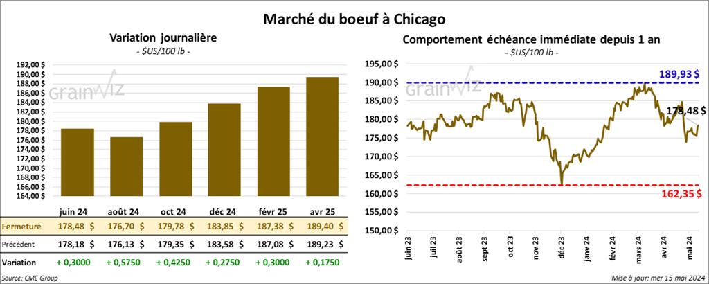Le contrat de bœuf US juin 24 a clôturé à 178,48 $ (+ 30 cents). Celui août 24 a fermé à 176,70 $ (+ 58 cents). Celui oct. 24 a terminé à 179,78 $ (+ 48 cents). Quant au veau US, le contrat mai 24 a fini à 243,15 $ (- 13 cents). Celui août 24 a clôturé à 255,88 $ (+ 20 cents). Celui sept. 24 a fermé à 256,95 $ (+ 33 cents).