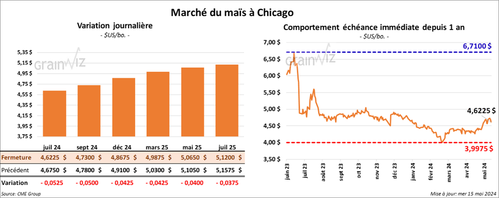 Le contrat de maïs US juil. 24 a clôturé à 4,6225 $ (- 8 ¼ cents). Celui sept. 24 a fermé à 4,7300 $ (- 5 cents). Celui déc. 24 a terminé à 4,8675 $ (- 4 ¼ cents).