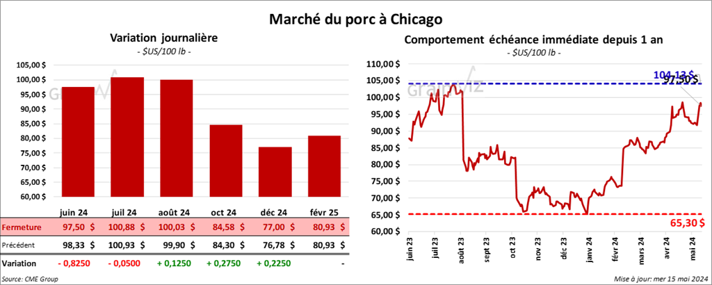 Le contrat de porc US juin 24 a clôturé à 97,50 $ (- 83 cents). Celui juil. 24 a fermé à 100,88 $ (- 5 cents). Celui août 24 a terminé à 100,03 $ (+ 13 cents).
