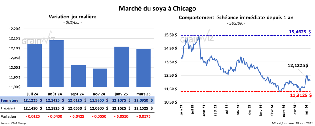 Le contrat de soya US juil. 24 a clôturé à 12,1225 $ (- ¼ cent). Celui août 24 a fermé à 12,1425 $ (- 94 cents). Celui sept. 24 a terminé à 12,0125 $ (- 4 ¼ cents). Quant au tourteau de soya US, le contrat juil. 24 a fini à 372,10 $/tonne (- 1,20 $/tonne). Celui août 24 a clôturé à 370,10 $/tonne (- 1,60 $/tonne). Celui sept. 24 a fermé à 369,60 $/tonne (- 1,60 $/tonne). Du côté de l’huile de soya US, le contrat juil. 24 a terminé à 43,55 $ (+ 15 points). Celui août 24 a fini à 43,85 $ (+ 14 points).