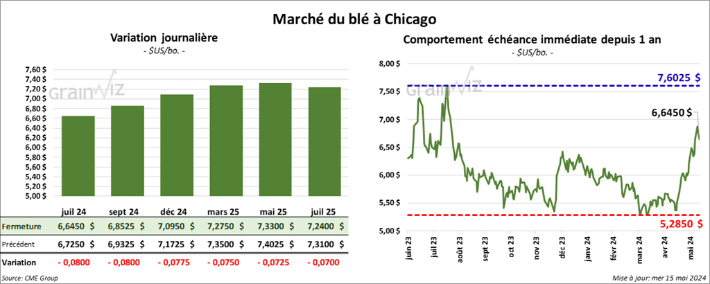 À Chicago, le contrat de blé juil. 24 a clôturé à 6,6450 $ (- 8 cents). Celui sept. 24 a fermé à 6,8525 $ (- 8 cents). Celui déc. 24 a terminé à 7,0950 $ (- 7 ¾ cents). À Kansas, le contrat de blé dur rouge juil. 24 a fini à 6,7500 $ (- 8 ¼ cents). Celui sept. 24 a clôturé à 6,8860 $ (- 8 ¼ cents). Celui déc. 24 a fermé à 7,0940 $ (- 8 ¼ cents). À Minneapolis, le contrat sept. 24 a terminé à 7,3375 $ (- 7 ¾ cents). Celui déc. 24 a fini à 7,4875 (- 6 ¾ cents). Celui mars 25 a clôturé à 7,5875 $ (- 7 ¾ cents).