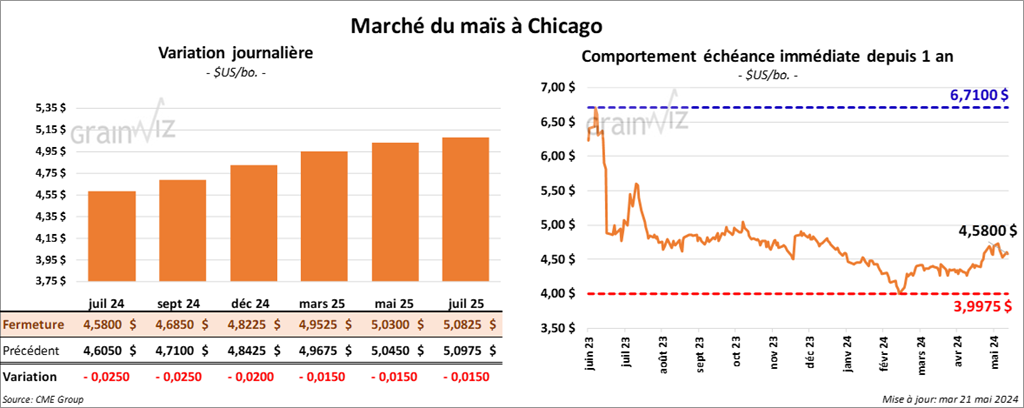 Le contrat de maïs juil. 24 a clôturé à 4,5800 $ (- 2 ½ cents). Celui sept. 24 a fermé à 4,6850 $ (- 2 ½ cents). Celui déc. 24 a terminé à 4,8225 $ (- 2 cents).