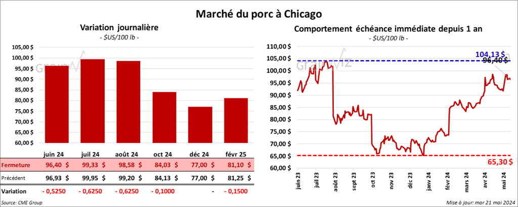 Le contrat de porc US juin 24 a clôturé à 96,40 $ (- 53 cents). Celui juil. 24 a fermé à 99,33 $ (- 63 cents). Celui août 24 a terminé à 98,58 $ (- 63 cents).