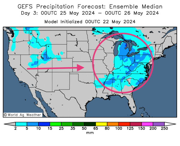 - Cette carte US, fournie par World Ag Weather et dessinée pour les 3 prochains jours, indique notamment des possibilités de pluies dans l’est et le nord-est, l’est et le sud du Corn Belt. Des probabilités de précipitations dans le sud-est US sont également visibles.