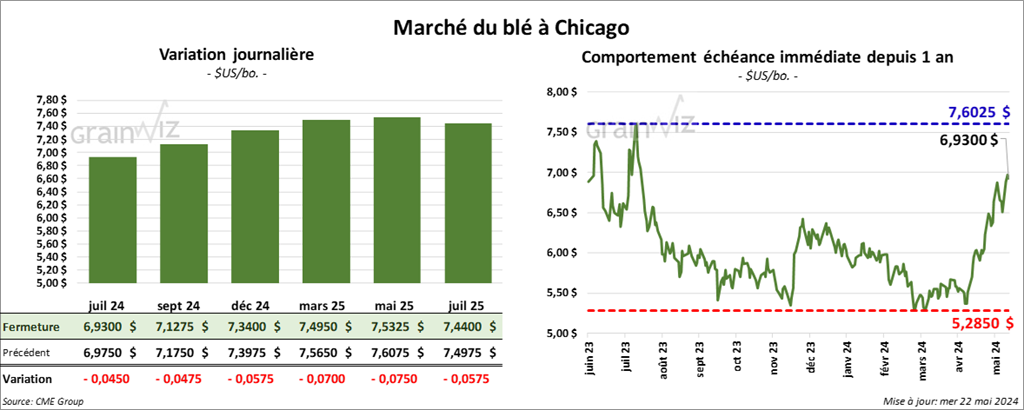 À Chicago, le contrat de blé juil. 24 a clôturé à 6,9300 $ (- 4 ½ cents). Celui sept. 24 a fermé à 7,1275 $ (- 4 ¼ cents). Celui déc. 24 a terminé à 7,3400 $ (- 5 ¾ cents). À Kansas, le contrat de blé dur rouge juil. 24 a fini à 6,9940 $ (- 2 cents). Celui sept. 24 a clôturé à 7,1360 $ (- 2 ½ cents). Celui déc. 24 a fermé à 7,3320 $ (- 3 ¾ cents). À Minneapolis, le contrat de blé de printemps sept. 24 a terminé à 7,4625 $ (- 2 cents). Celui déc. 24 a fini à 7,6125 $ (- 2 cents). Celui mars 25 a clôturé à 7,7275 $ (- 2 ¾ cents).
