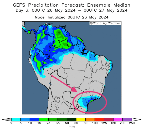 - World Weather anticipe à court terme des précipitations additionnelles pour l’extrême sud du Brésil. Il précise toutefois que ces averses dans le Rio Grande do Sul devraient être assez légères, limitant ainsi le risque d’inondation additionnel. Par contre, l’organisme mentionne qu’elles pourraient suffire à abaisser les estimations de la récolte de soya de la région.